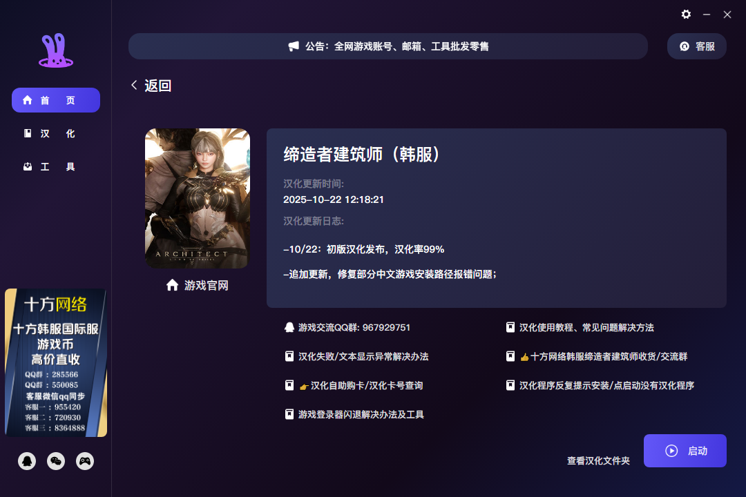 安装成功点击启动即可启动汉化程序,运行汉化前请关闭游戏,汉化程序登录之后再启动的游戏方可汉化成功。